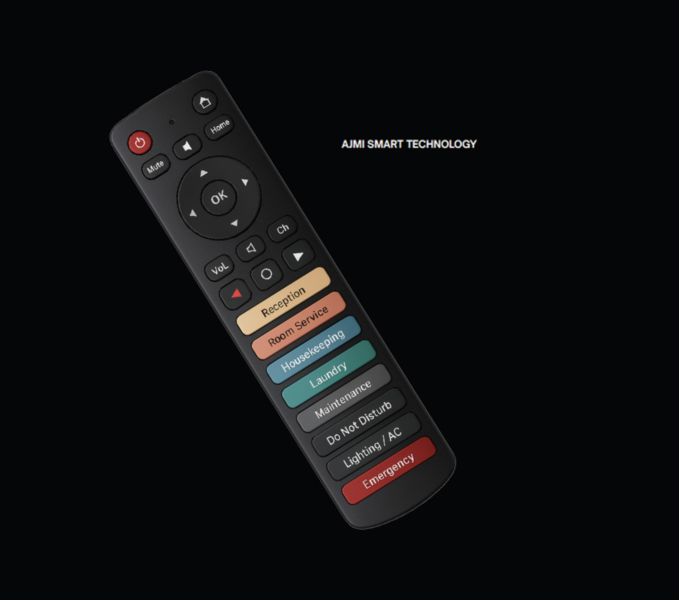The Ajmi Smart Remote redefines how people interact with technology inside hotels, hospitals, and smart living spaces. Designed to connect comfort and communication, every button — from Nurse Call, Housekeeping, and Laundry to Reception, Room Service, and Inbox Notifications — works instantly through the Macvision Middleware, ensuring real-time response and seamless coordination across all departments. Whether used by a patient, guest, or staff member, the Ajmi Smart Remote eliminates complexity and brings all essential functions to one elegant device. Its intelligent design unites technology, safety, and convenience, turning every simple touch into a connected, human-friendly experience.